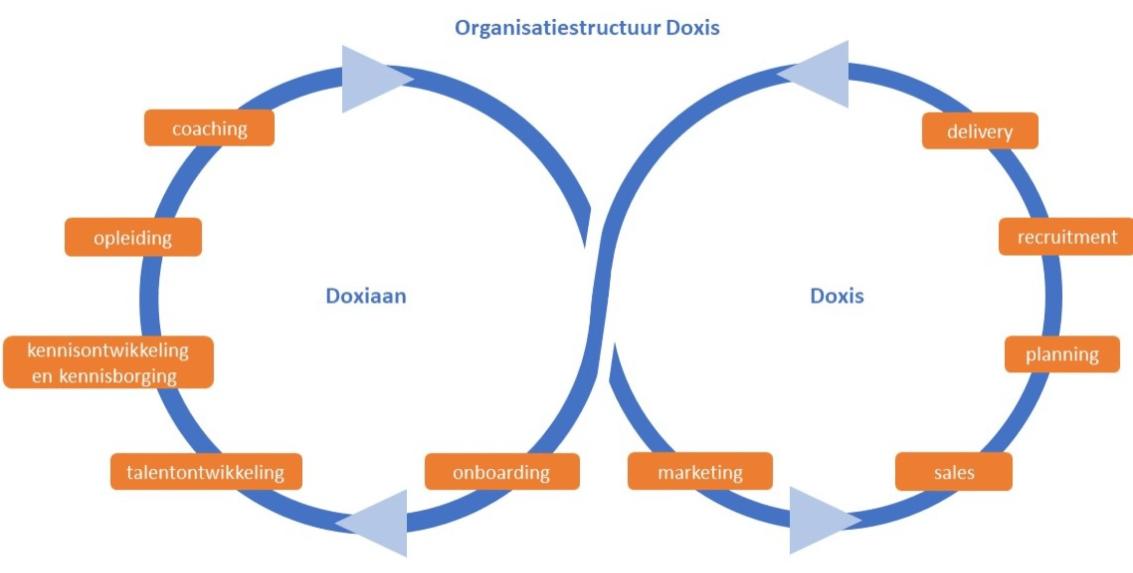 Binnen Doxis hebben we geen traditioneel ‘organisatie-harkje’. Het besturingsmodel van Doxis heeft de vorm van een gekantelde acht. Rechts de Doxis organisatie en links de Doxianen. Rechts kan niet zonder links en vise versa. Doxis kan niet zonder Doxianen die zich ontwikkelen en als de ontwikkeling van Doxianen goed verloopt kan Doxis weer mooie opdrachten voor hen organiseren en daarmee commercieel succesvol zijn, waardoor Doxianen zich weer verder kunnen ontwikkelen, etc. Michiel: “Dit model hebben we intern verder vorm en inhoud gegeven en is een fijne leidraad.”